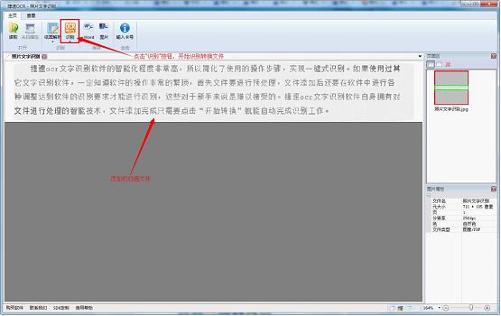 第三步,文件添加完成,大家可以识别整个文件,也可以直接选取一部分文件内容。用户可以点击"识别"按钮对选取的文件内容进行识别,软件界面右侧就会显示该内容所识别出来的文字。
