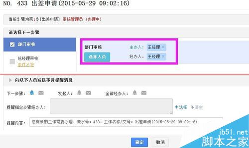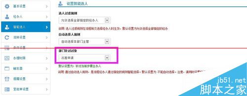 1、首先,需要确认的是设置的智能选人规则是否正确。比如下图所示的‘出差申请’中的第二步‘部门审核’,‘自动选择人规则’是‘自动选择本部门主管’,而下方的‘部门针对对象’必须选为第一步‘出差申请’的申请人的部门主管才合理。