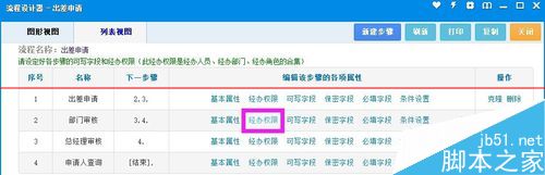 2、其次,确认经办权限是否正确。流程的‘列表视图’选项卡下,点击‘经办权限’。