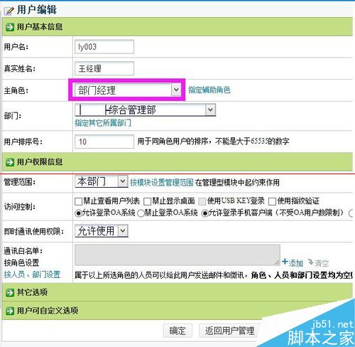 4、最后,确认部门主管权限设置正确。这一项需要确认两个地方,一个是部门设置,一个是用户的账户设置。