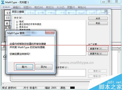 2、在弹出的"自定义键盘"对话框中选择出厂设置下的"全部重置",在弹出的警告对话框中点击确定即可。现在你可以用Bckspace或者Delete键删除之前的输入了。