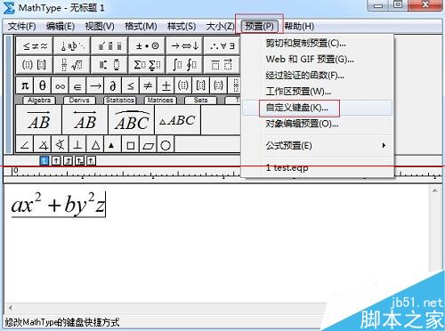 1、MathType编辑窗口中选择"预置"——"自定义键盘"。