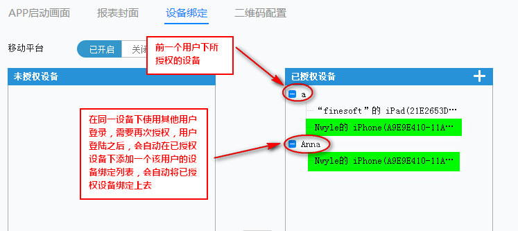 此时,管理员在PC端登录系统,进入管理系统>移动平台>设备绑定,已授权设备面板中可看到aa用户下的绑定的设备只剩下一个,而那个被撤销授权的设备重新回到了未授权设备面板中,如下图: