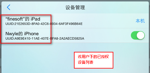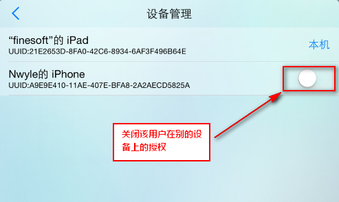 滑动设备名称后面的按钮,可撤销该用户下对该设备的授权,如下图: