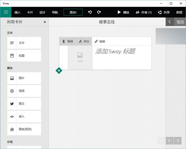 • Sway 是一款数字故事分享应用,适合公司、学校和家庭使用,使你能够快速而轻松地创建和共享精美的交互式报表、演示文稿、个人故事等。 请添加你的内容,其他的交给我们。
