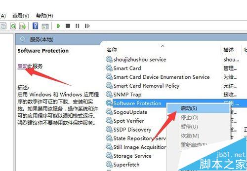 3、从打开的"服务"窗口中:针对Win10系统,找到"Software Protection"服务项并右击选择"启动"项以启动此服务。