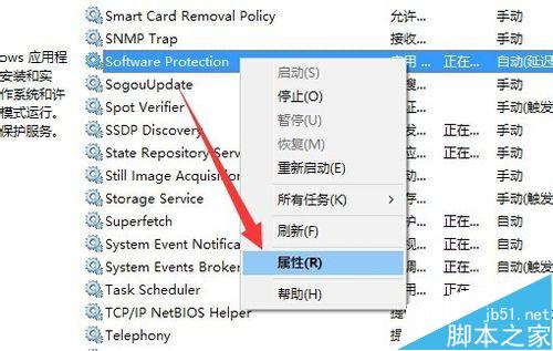 5、此外,为了防止以后再次发生此类"无法验证此产品的许可证"的问题,我们需要执行以下操作:右击"Software Protection"服务项,从其右键菜单中选择"属性"项。