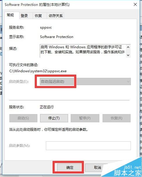 6、从打开的"Software Protection 属性"窗口中,将"启动类型"设置为"自动"或"自动(延时)",点击"确定"进行保存即可。