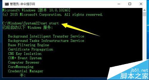 2、从打开的"命令提示符"界面中,输入"net start"并按回车以查看当前所有已启动的Windows服务。从中可以查看是否存在"Software Protection"或"Office Software Protection Platform"服务,如果不存在,则需要重启此服务。如图所示: