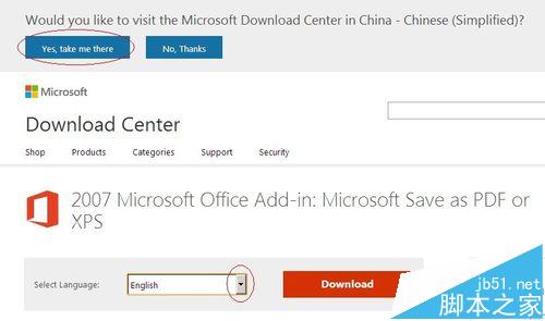6、这里会打开微软下载中心的页面,如图,可能会是英文的,提示:Would you like to visit the Microsoft Download Center in China - Chinese (Simplified)?这个是问你是否要访问中国的微软下载中心中文(简体),你可以点"YES",或者在下方选择适合你的语言再下载。