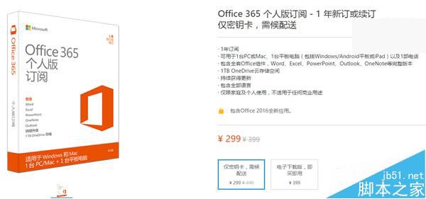 微软官方商城针对Office365个人订阅版(密钥卡)正进行特价活动,原价399元,现价299元,同时赠送229元微软WH-308耳机,并且即刻升级Office2016正式版,立刻购买。