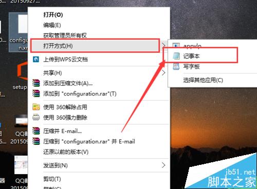6、接下来,打开桌面中的configuration.xml文件,然后对着该文件击右键,在弹出的菜单中,点击选择"使用记事本程序"打开该文件。