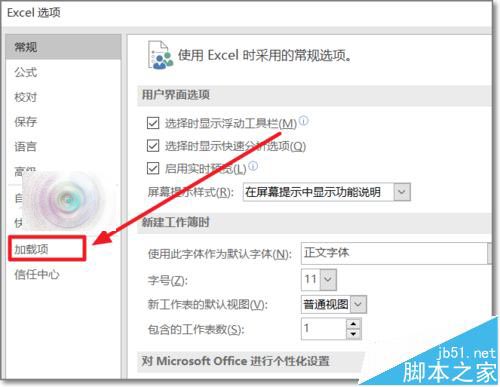 2、加载项在Excel选项中,点击"选项"进入设置。