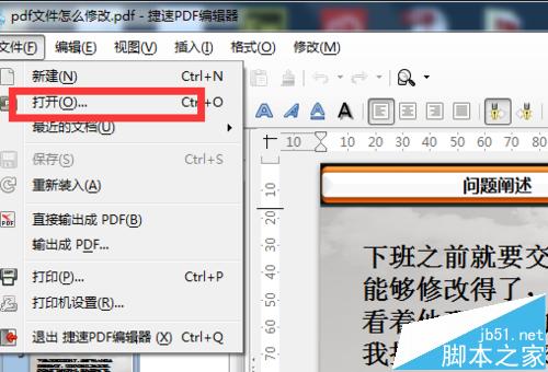 1、打开编辑软件,点击"文件"中的"打开"就会弹出对话框,到保存PDF文件的文件夹把需要编辑的文件打开。