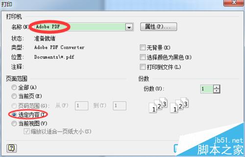 3、在弹出的打印对话框中,打印子选择"Adobe PDF",勾选"选定内容"前面的复选框。