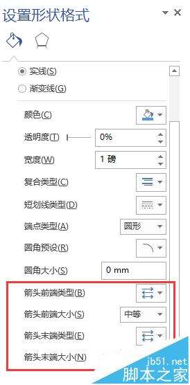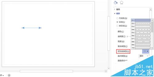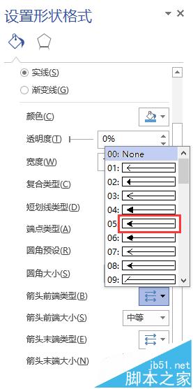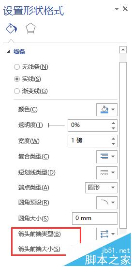 6、在右侧设置形状格式选择【线条】,进入线条设置选项,在该选项下可以找到设置箭头前端类型和设置箭头末端类型的选项,也可以设置箭头的大小,如下图所示。