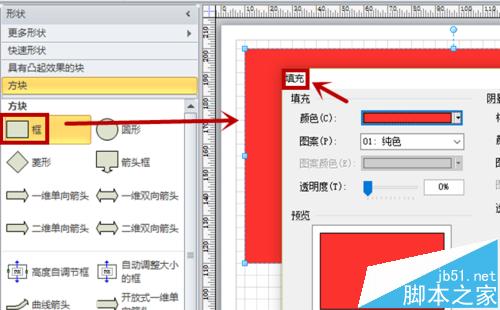 2、从左侧形状栏中将"矩形"拖至右侧编辑区,并单击鼠标右键,调整其"填充"格式为"红色"。