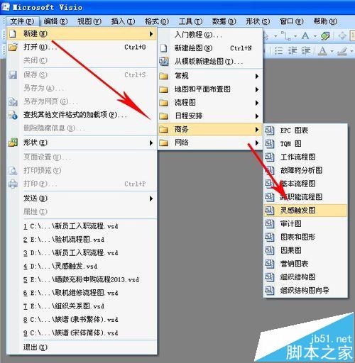 1、新建灵感触发图的方法很简单,打开VISIO软件,依次点击"文件"-"新建"-"商务"-"灵感触发图"即可,如下图示: