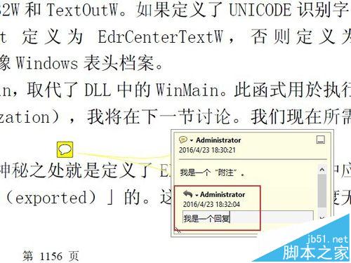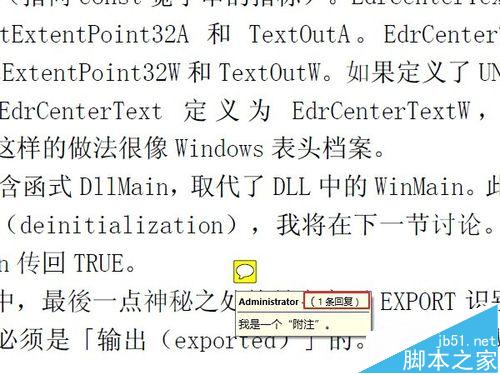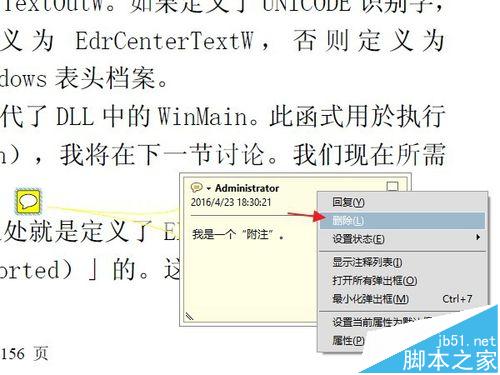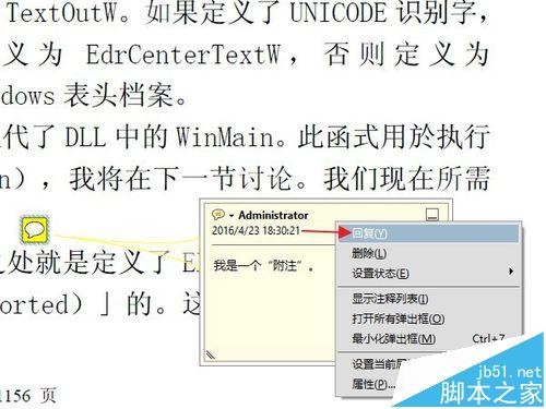 8、实际上,附注的基本功能到此已经够用了。但是有的时候,我们更需要一些比较小众化,或者个性化的需求,下面简要的说几个。比如这个文档添加一个附注后,需要其他不同的用户阅读时,对这条附注里的问题做出回答,或者写下体会,特殊要求,等等。那么可以用到"回复"功能。鼠标右键点击附注,然后选择"回复"。