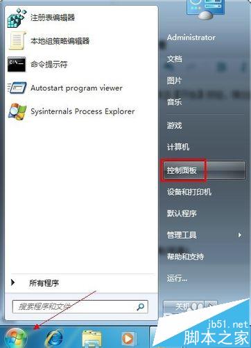 1、单击【开始】按钮,弹出的菜单窗口单击【控制面板】命令