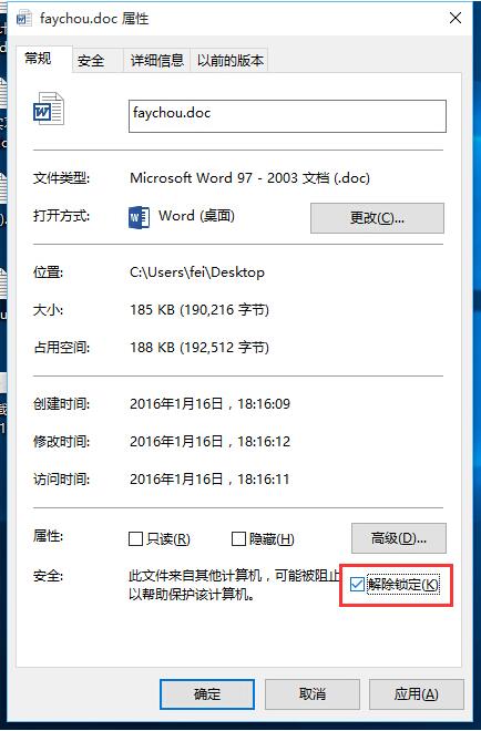 我们只需"鼠标右键"该文件,选择"属性",你会发现在常规面板最下方多了一个"安全",将"解除锁定"前的勾去掉就行了。