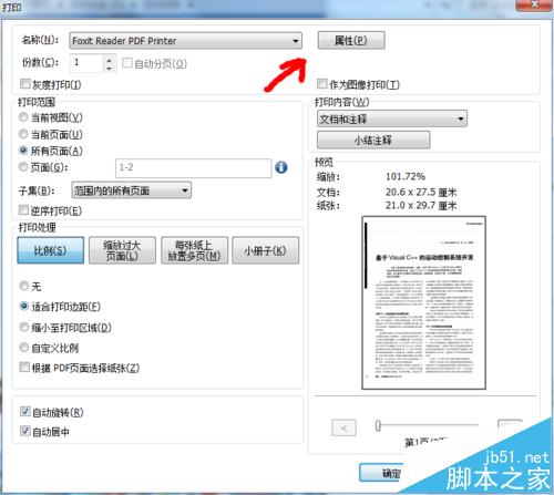 3、弹出打印属性窗口后点击"属性",如箭头所示。