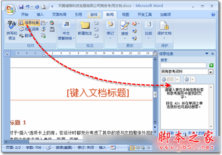 (1)启动Word 2007,在"审阅"选项卡的"校对"选项组中,单击【信息检索】按钮,打开"信息检索"任务窗格,如图1所示。