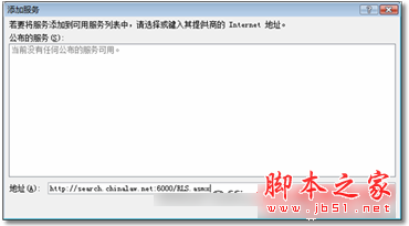 (3)在"信息检索选项"对话框中,单击【添加服务】按钮,打开"添加服务"对话框。在对话框中的"地址"文本框中,输入中国法律法规查询服务的URL地址,即"http://search.chinalaw.net:6000/RLS.asmx",如图3所示。