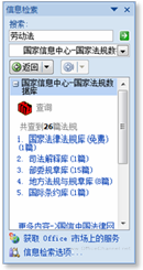 (5)服务添加完成后,就可以在Office应用程序中查询相应的法律法规了。例如,若要查询与"劳动法"相关的法律法规,只需在"信息检索"任务窗格中的"搜索"文本框中输入"劳动法",然后在下方的下拉列表框中选择刚刚添加的服务"国家信息中心—国家法规数据库",即可在任务窗格中看到所有与"劳动法"相关的法律法规,如图5所示。