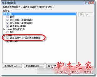 (4)单击对话框中的【添加】按钮,在随即打开的对话框中,连续单击【继续】和【安装】按钮,并接受协议条款。安装完毕后,在"信息检索选项"对话框中的"服务"列表框中,可以看到刚刚添加的法律条款查询服务,如图4所示。