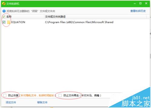 3、在弹出的对话框中选中此文件(这个步骤是360自动的),然后确认下方的两个复选框未被勾选(勾选的话删除速度会比较慢,针对此次删除的目的,我们无须勾选),然后点击右下角的粉碎文件