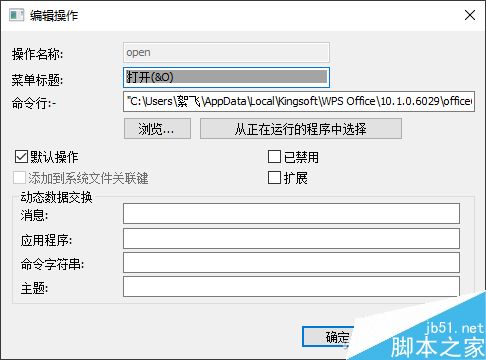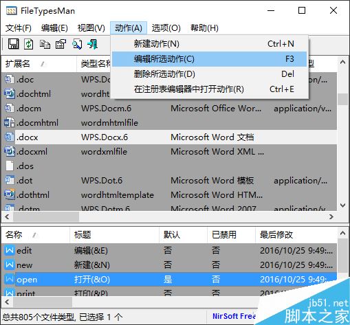 比如选中".docx"后,再在下方动作中选中"open"项,然后点击菜单"动作→编辑所选动作"。再打开的编辑操作对话框中,勾选"默认操作"项,"确定"就可以啦。再试试打不开的Office文档,是不是正常啦。