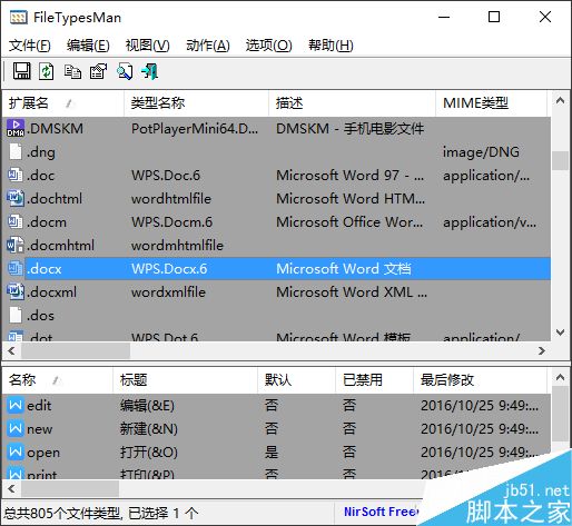 双击FileTypesMan.exe文件运行程序,如果是Word文件打不开就选中".docx",如果是Excel文档打不开则选中".xlsx"。相信大家看出来了,这一软件并非只针对Office文档,实际上支持系统中所有的文件类型。