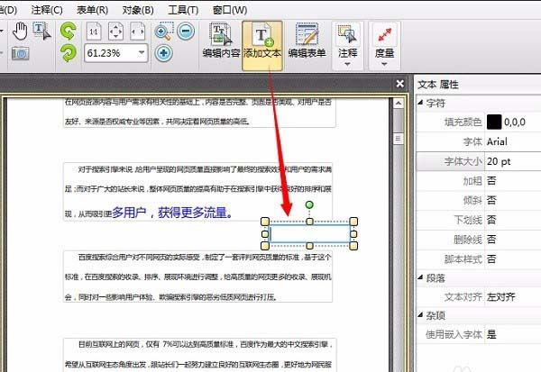 3、选择工具栏上的添加文本工具,可以在页面点击插入一个文本框,然后输入文本内容。