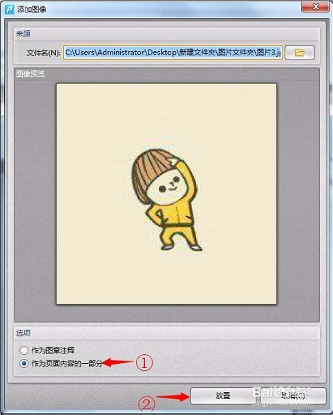 6、在添加图像对的下方选择"作为页面内容一部分"选项,点击"放置",图片就添加到页面了。