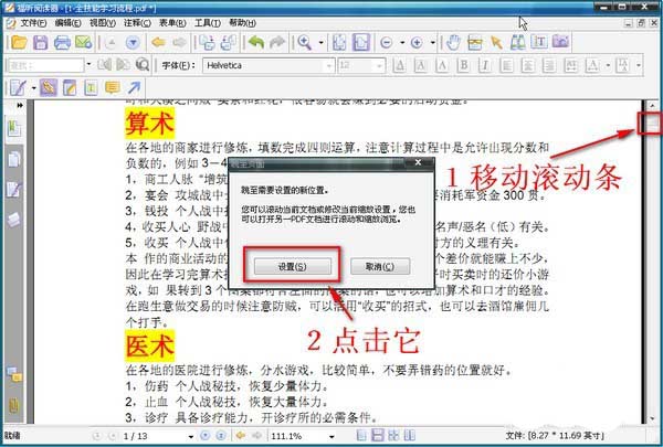 4、在弹出设置窗口后,移动滚动条到需要的位置。就是内容开头处。点击"设置",创建链接完成。此时文字显示被选中状态。