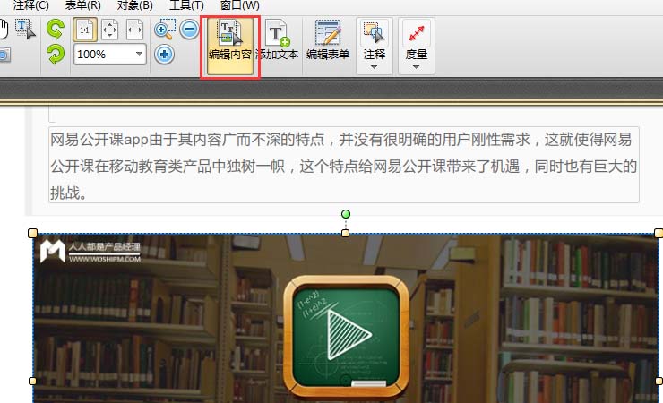 2、需要点击"编辑内容"选项才能对pdf文件的内容进行修改。