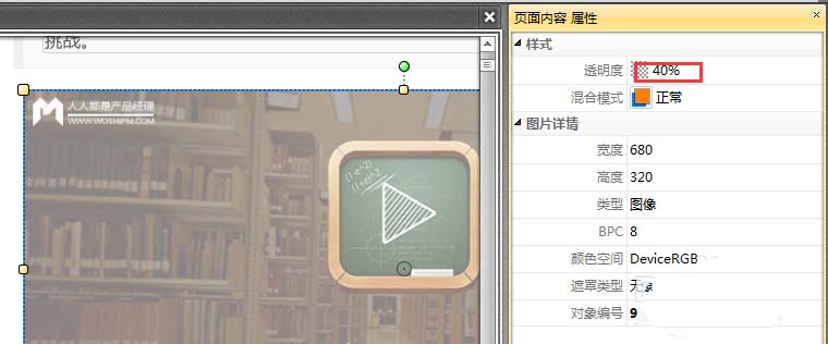 4、在右侧显示出来的就是该图片的属性,可更改图片透明度,将"100%"改为"40%"。