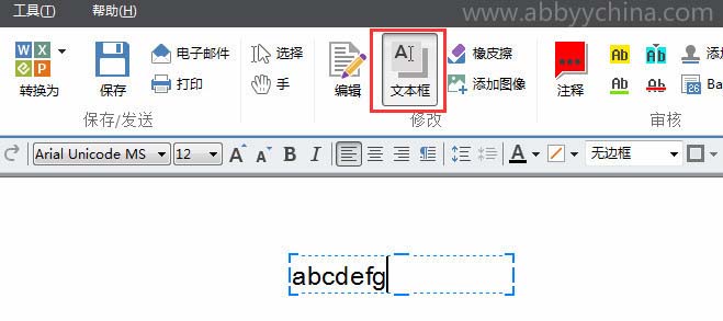 4、若要编辑空白页面,点击工具栏上的文本框按钮,工具栏下面空白文档上面将出现编辑选项,然后将鼠标移到空白页面上,在需要添加内容的地方点击即可输入内容,还可更改字体样式、大小、颜色等,完成之后再次点击文本框按钮,退出编辑模式,保存文档。