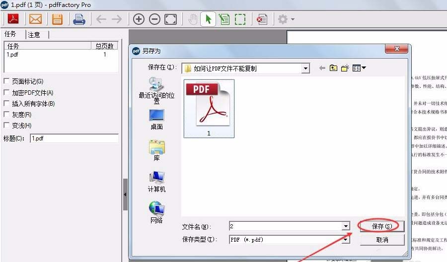 6、打印完成,弹出已经完成的PDF文件,点击保存图标,弹出保存对话框后,选择存放位置后点保存。