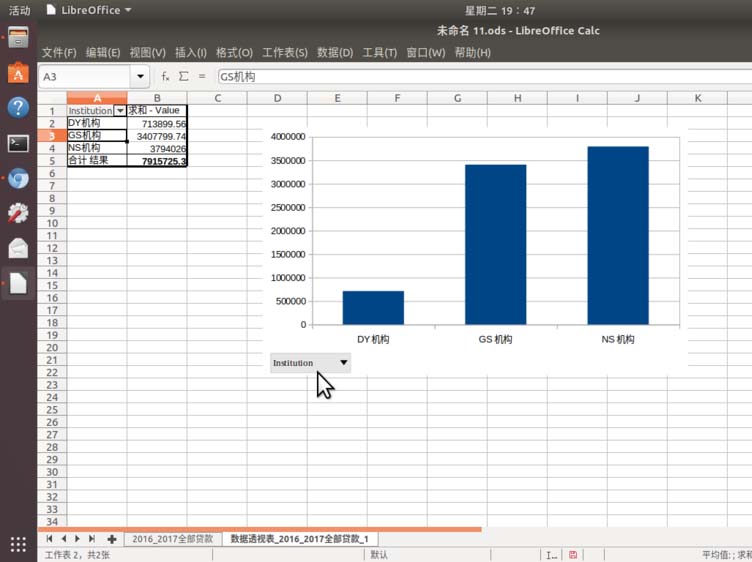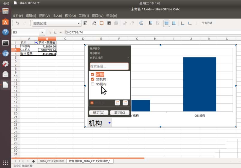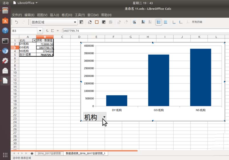 7、在生成的数据透视图的左下角,有一个根据数据表中的"机构"字段生成的下拉菜单,单击弹出菜单,里面包括数据表中所有的机构名称,可以根据需要取消某个机构名称前面的复选框,使其不在数据透视表中显示。