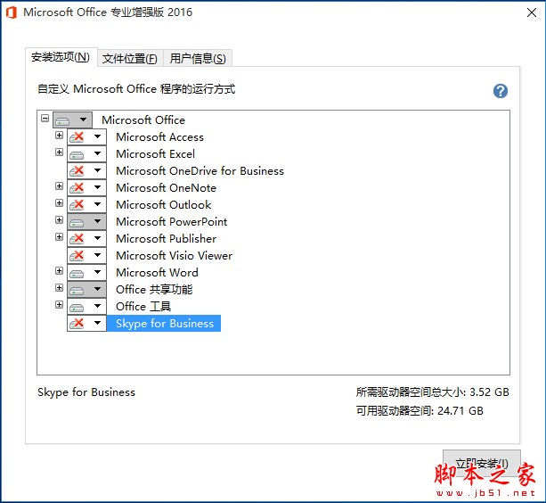 4. 下图仅供参考,只安装了"办公三剑客":Word + Excel + PPT. 大家可以根据实际情况,在"安装选项"中关闭自己不需要的功能;还可以在"文件位置"中,指定安装位置。