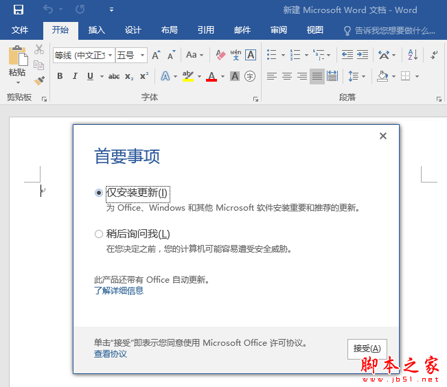 6. 在桌面右键,任意新建一个Offcie文档(如Word),并打开,会出现下图提示:(点"接受")