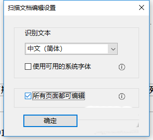 3、点击图中右下角扫描文档下的"设置",在弹出的窗口中勾选"所有页面均可编辑",点击确定,再点击编辑图像时,就可以全篇识别了。