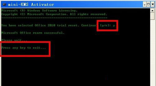 7、然后点击最下面的Rearm Office 2010,输入y,按回车,等待一会,出现"Prease any key to exit.。。",就可以把当前的对话窗口关闭了。