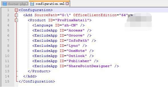 • ExcludeApp表示不被安装的组件,你可以看到这里面不包括Word、PowerPoint和Excel,我们的目的就是只安装这三个组件。你可以根据自己的需要删除或增加ExcludeApp。