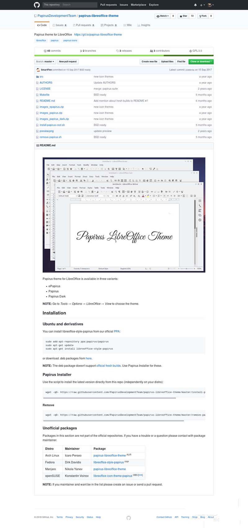 5、你也可以在互联网上找到其它主题。Github上也有不少关于图标、主题之类的软件项目。下图则是"Papirus theme for LibreOffice"项目的页面。