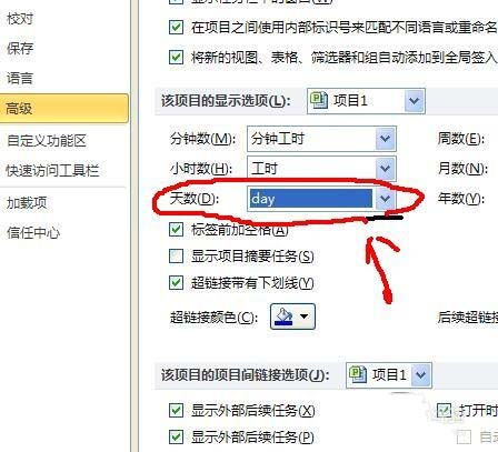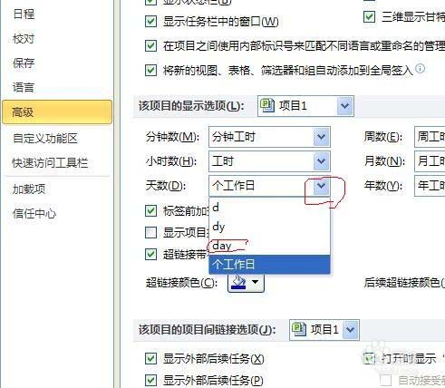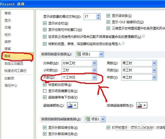 3、左边选项中选择高级选项,下拉一下,找到天数,这时候我们看到该选项默认是工作日。