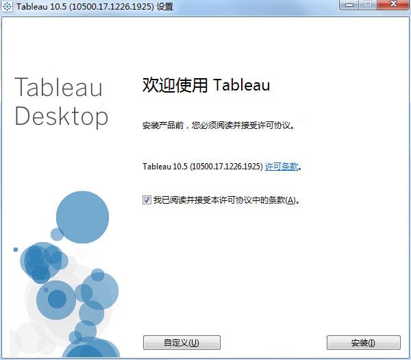 1、运行"TableauDesktop-64bit-10-5-0.exe",勾选用户协议,点击自定义自行选择安装类型,或者直接点击安装