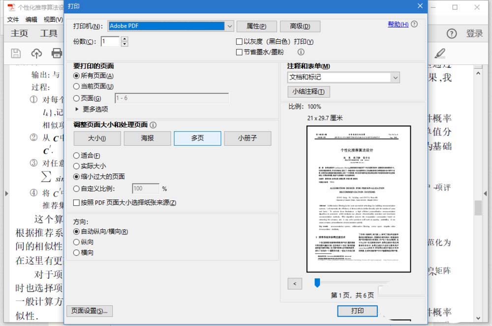 3、选择打印机:Adobe PDF或Microsoft Print to PDF,在要打印的页面选择需要切割出的页码。点击打印。